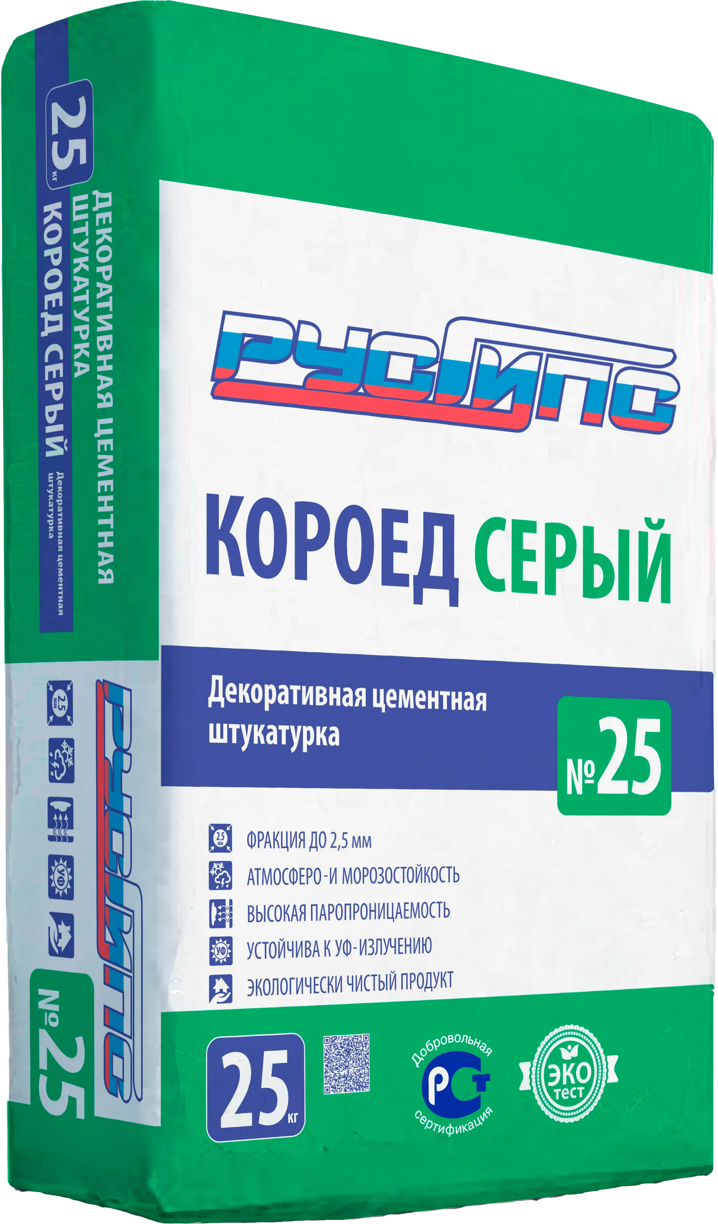 Русгипс №25 «Короед» — декоративная минеральная штукатурка на цементной основе, предназначенная для финишной отделки фасадов и стен внутри помещений. Создаёт фактурную поверхность с характерным рисунком «короед», обеспечивая надёжную защиту основания от влаги, перепадов температур и механических воздействий. Подходит для систем утепления и окрашивания фасадными красками.