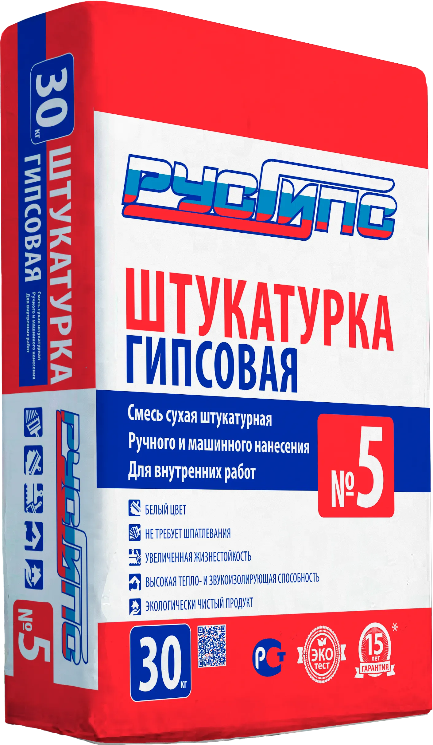 Русгипс №5 — это универсальная гипсовая штукатурка для внутренних отделочных работ, предназначенная для ручного и машинного выравнивания стен и потолков. Материал обеспечивает отличную адгезию к минеральным основаниям, обладает высокой пластичностью и формирует прочную, гладкую поверхность под покраску, обои или декоративную отделку.