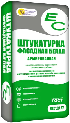 ЕС Фасадная белая — это высококачественная цементная штукатурка с добавлением минеральных наполнителей и белого цемента, предназначенная для выравнивания стен и потолков как снаружи, так и внутри зданий. Отличается повышенной прочностью, устойчивостью к атмосферным воздействиям и удобством нанесения. Белый цвет облегчает последующую отделку и снижает расход краски или декоративных материалов.