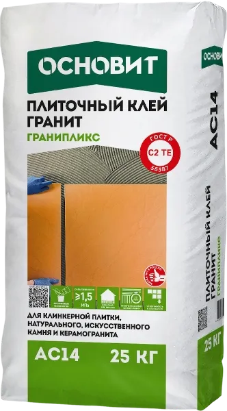 Основит Гранипликс AC14 (C2TE, серый) — высокопрочный плиточный клей для тяжёлых облицовочных материалов: керамогранита, клинкера и натурального камня форматом до 80×80 см. Подходит для фасадов, террас, бассейнов, систем «тёплый пол», устойчив к воде и морозу.