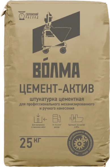 Волма Цемент-Актив — прочная цементно-песчаная штукатурка для выравнивания стен и потолков в условиях повышенной нагрузки и влажности. Применяется для наружных и внутренних работ, образуя надёжную основу под последующую отделку. Материал устойчив к влаге, морозу и перепадам температур, обладает высокой адгезией и долговечностью.